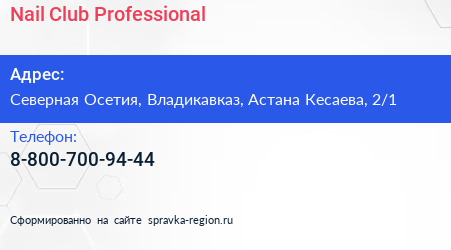 Nail Club Professional по адресу Северная Осетия, Владикавказ, Астана Кесаева, 2/1 в дальнейшем Организация, размещена в следующих категориях: