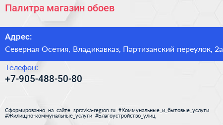Палитра, магазин обоев по адресу Северная Осетия, Владикавказ, Партизанский переулок, 2а в дальнейшем Организация, размещена в следующих категориях: