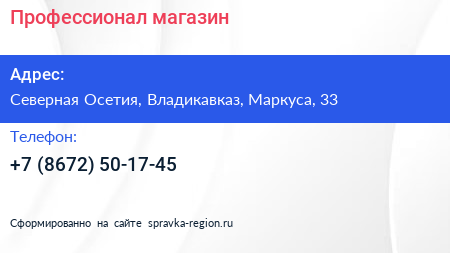 Профессионал, магазин по адресу Северная Осетия, Владикавказ, Маркуса, 33 в дальнейшем Организация, размещена в следующих категориях: