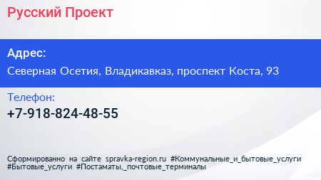 Русский Проект по адресу Северная Осетия, Владикавказ, проспект Коста, 93 в дальнейшем Организация, размещена в следующих категориях: