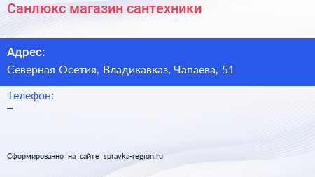 Санлюкс, магазин сантехники по адресу Северная Осетия, Владикавказ, Чапаева, 51 в дальнейшем Организация, размещена в следующих категориях: