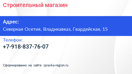 Строительный магазин по адресу Северная Осетия, Владикавказ, Гвардейская, 15 в дальнейшем Организация, размещена в следующих категориях: