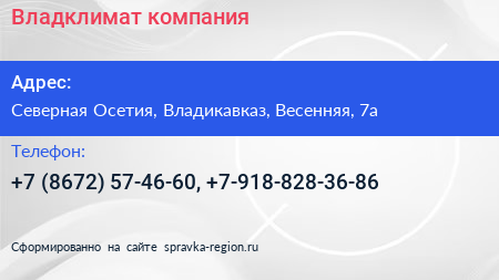 Владклимат, компания по адресу Северная Осетия, Владикавказ, Весенняя, 7а в дальнейшем Организация, размещена в следующих категориях: