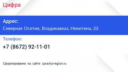 Цифра по адресу Северная Осетия, Владикавказ, Никитина, 22 в дальнейшем Организация, размещена в следующих категориях: