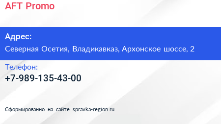 AFT Promo по адресу Северная Осетия, Владикавказ, Архонское шоссе, 2 в дальнейшем Организация, размещена в следующих категориях: