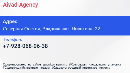 Aivad Agency по адресу Северная Осетия, Владикавказ, Никитина, 22 в дальнейшем Организация, размещена в следующих категориях: