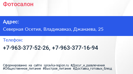 Фотосалон по адресу Северная Осетия, Владикавказ, Джанаева, 25 в дальнейшем Организация, размещена в следующих категориях: