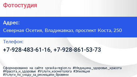 Фотостудия по адресу Северная Осетия, Владикавказ, проспект Коста, 250 в дальнейшем Организация, размещена в следующих категориях: