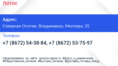 Лотос по адресу Северная Осетия, Владикавказ, Миллера, 35 в дальнейшем Организация, размещена в следующих категориях: