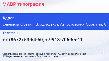 МАВР, типография по адресу Северная Осетия, Владикавказ, Августовских Событий, 8 в дальнейшем Организация, размещена в следующих категориях: