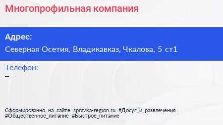 Многопрофильная компания по адресу Северная Осетия, Владикавказ, Чкалова, 5 ст1 в дальнейшем Организация, размещена в следующих категориях: