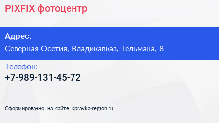 PIXFIX, фотоцентр по адресу Северная Осетия, Владикавказ, Тельмана, 8 в дальнейшем Организация, размещена в следующих категориях: