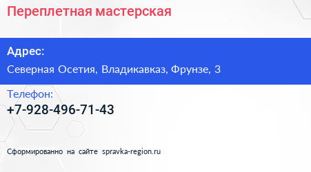 Переплетная мастерская по адресу Северная Осетия, Владикавказ, Фрунзе, 3 в дальнейшем Организация, размещена в следующих категориях: