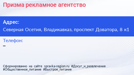 Призма, рекламное агентство по адресу Северная Осетия, Владикавказ, проспект Доватора, 8 к1 в дальнейшем Организация, размещена в следующих категориях: