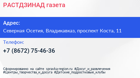 РАСТДЗИНАД, газета по адресу Северная Осетия, Владикавказ, проспект Коста, 11 в дальнейшем Организация, размещена в следующих категориях: