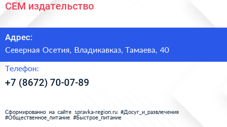 СЕМ, издательство по адресу Северная Осетия, Владикавказ, Тамаева, 40 в дальнейшем Организация, размещена в следующих категориях: