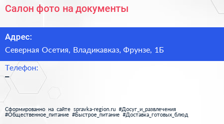 Салон фото на документы по адресу Северная Осетия, Владикавказ, Фрунзе, 1Б в дальнейшем Организация, размещена в следующих категориях: