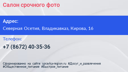 Салон срочного фото по адресу Северная Осетия, Владикавказ, Кирова, 16 в дальнейшем Организация, размещена в следующих категориях: