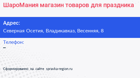 ШароМания, магазин товаров для праздника по адресу Северная Осетия, Владикавказ, Весенняя, 8 в дальнейшем Организация, размещена в следующих категориях: