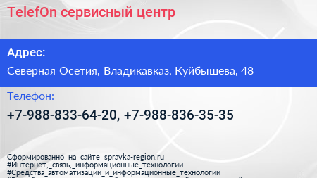 TelefOn, сервисный центр по адресу Северная Осетия, Владикавказ, Куйбышева, 48 в дальнейшем Организация, размещена в следующих категориях: