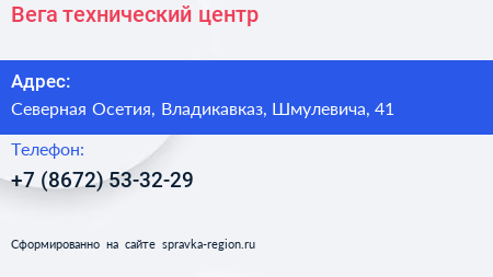 Вега, технический центр по адресу Северная Осетия, Владикавказ, Шмулевича, 41 в дальнейшем Организация, размещена в следующих категориях: