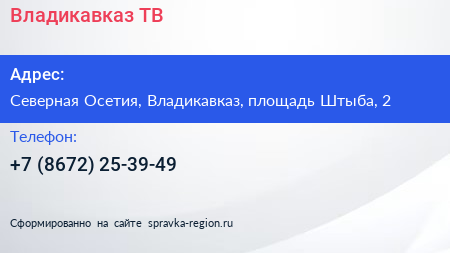 Владикавказ-ТВ по адресу Северная Осетия, Владикавказ, площадь Штыба, 2 в дальнейшем Организация, размещена в следующих категориях: