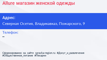 Allure, магазин женской одежды по адресу Северная Осетия, Владикавказ, Пожарского, 9 в дальнейшем Организация, размещена в следующих категориях: