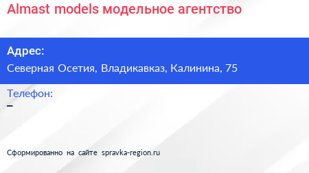Almast models, модельное агентство по адресу Северная Осетия, Владикавказ, Калинина, 75 в дальнейшем Организация, размещена в следующих категориях: