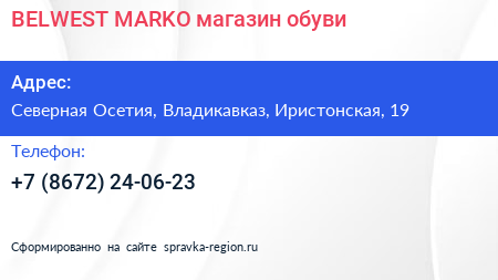 BELWEST MARKO, магазин обуви по адресу Северная Осетия, Владикавказ, Иристонская, 19 в дальнейшем Организация, размещена в следующих категориях: