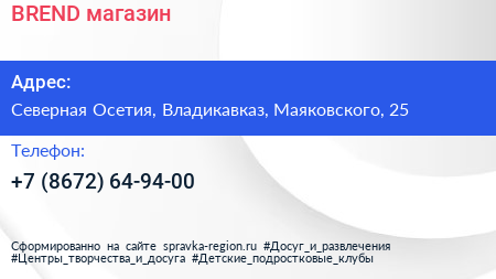 BREND, магазин по адресу Северная Осетия, Владикавказ, Маяковского, 25 в дальнейшем Организация, размещена в следующих категориях: