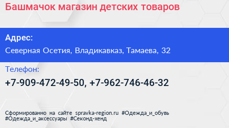 Башмачок, магазин детских товаров по адресу Северная Осетия, Владикавказ, Тамаева, 32 в дальнейшем Организация, размещена в следующих категориях: