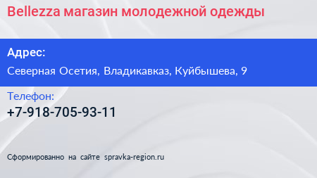 Bellezza, магазин молодежной одежды по адресу Северная Осетия, Владикавказ, Куйбышева, 9 в дальнейшем Организация, размещена в следующих категориях: