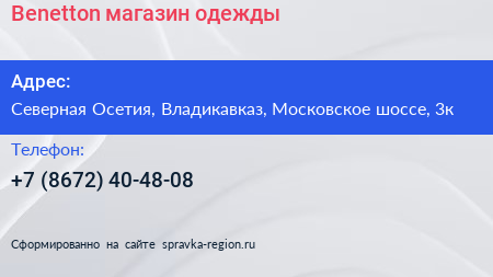 Benetton, магазин одежды по адресу Северная Осетия, Владикавказ, Московское шоссе, 3к в дальнейшем Организация, размещена в следующих категориях: