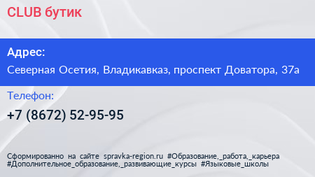 CLUB, бутик по адресу Северная Осетия, Владикавказ, проспект Доватора, 37а в дальнейшем Организация, размещена в следующих категориях: