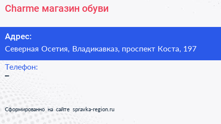 Charme, магазин обуви по адресу Северная Осетия, Владикавказ, проспект Коста, 197 в дальнейшем Организация, размещена в следующих категориях: