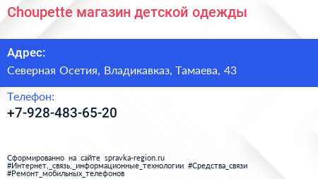 Choupette, магазин детской одежды по адресу Северная Осетия, Владикавказ, Тамаева, 43 в дальнейшем Организация, размещена в следующих категориях: