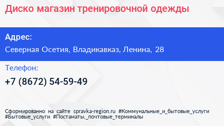 Диско, магазин тренировочной одежды по адресу Северная Осетия, Владикавказ, Ленина, 28 в дальнейшем Организация, размещена в следующих категориях: