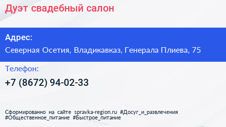 Дуэт, свадебный салон по адресу Северная Осетия, Владикавказ, Генерала Плиева, 75 в дальнейшем Организация, размещена в следующих категориях: