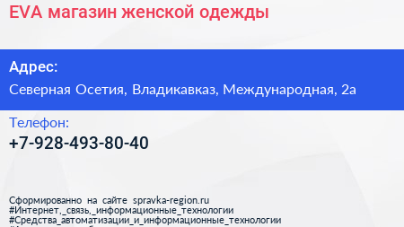 EVA, магазин женской одежды по адресу Северная Осетия, Владикавказ, Международная, 2а в дальнейшем Организация, размещена в следующих категориях: