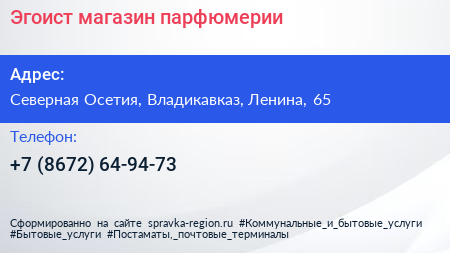 Эгоист, магазин парфюмерии по адресу Северная Осетия, Владикавказ, Ленина, 65 в дальнейшем Организация, размещена в следующих категориях:
