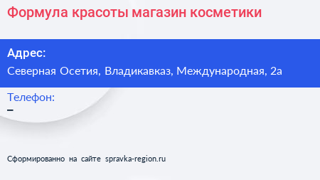Формула красоты, магазин косметики по адресу Северная Осетия, Владикавказ, Международная, 2а в дальнейшем Организация, размещена в следующих категориях: