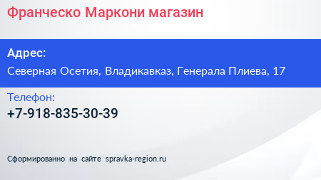 Франческо Маркони, магазин по адресу Северная Осетия, Владикавказ, Генерала Плиева, 17 в дальнейшем Организация, размещена в следующих категориях: