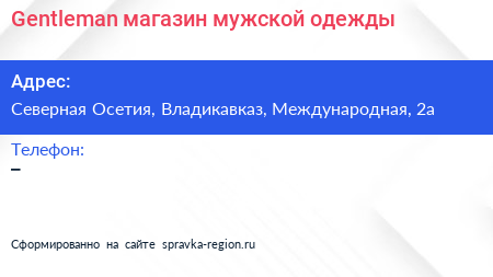 Gentleman, магазин мужской одежды по адресу Северная Осетия, Владикавказ, Международная, 2а в дальнейшем Организация, размещена в следующих категориях: