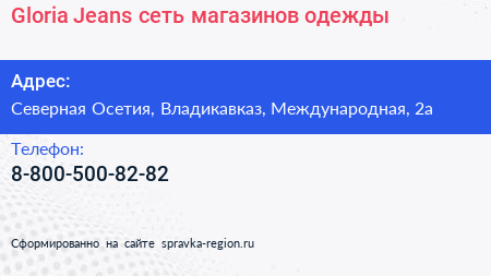 Gloria Jeans, сеть магазинов одежды по адресу Северная Осетия, Владикавказ, Международная, 2а в дальнейшем Организация, размещена в следующих категориях: