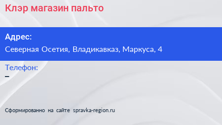 Клэр, магазин пальто по адресу Северная Осетия, Владикавказ, Маркуса, 4 в дальнейшем Организация, размещена в следующих категориях:
