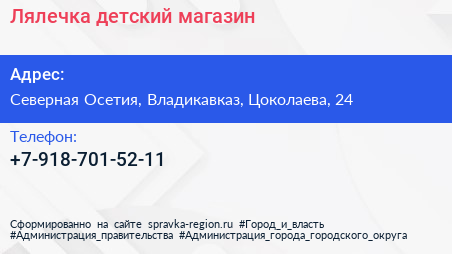 Лялечка, детский магазин по адресу Северная Осетия, Владикавказ, Цоколаева, 24 в дальнейшем Организация, размещена в следующих категориях: