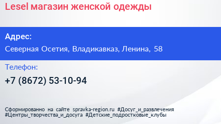 Lesel, магазин женской одежды по адресу Северная Осетия, Владикавказ, Ленина, 58 в дальнейшем Организация, размещена в следующих категориях:
