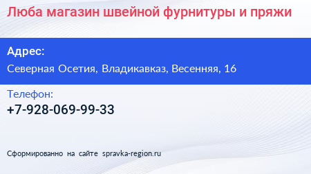 Люба, магазин швейной фурнитуры и пряжи по адресу Северная Осетия, Владикавказ, Весенняя, 16 в дальнейшем Организация, размещена в следующих категориях: