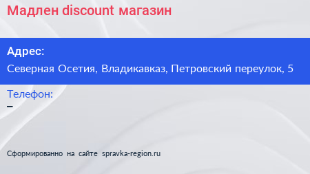 Мадлен discount, магазин по адресу Северная Осетия, Владикавказ, Петровский переулок, 5 в дальнейшем Организация, размещена в следующих категориях: