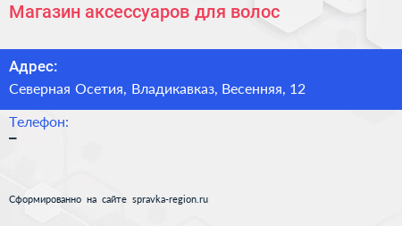 Магазин аксессуаров для волос по адресу Северная Осетия, Владикавказ, Весенняя, 12 в дальнейшем Организация, размещена в следующих категориях:
